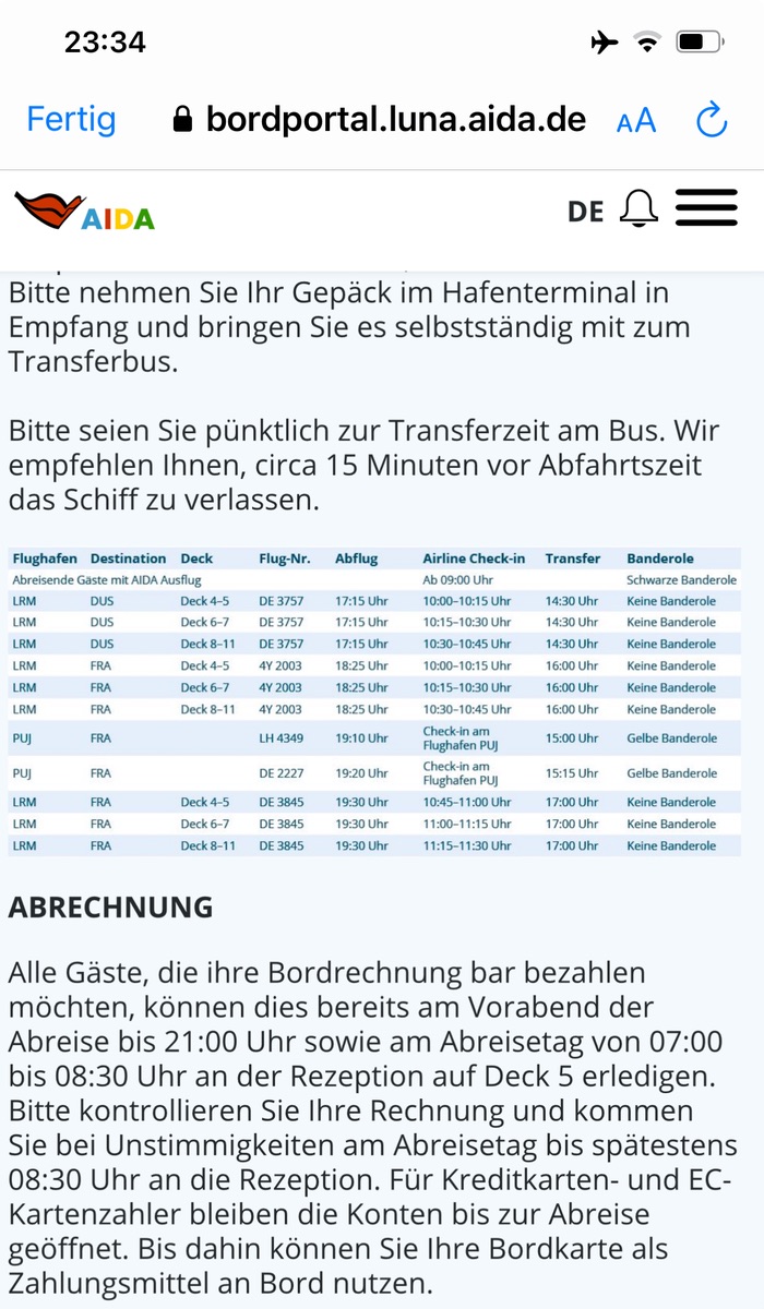 Was teils für alle noch schlimmer ist, AIDA interessiert das nicht bei den Transferzeiten. Es wird stur zum Flughafen gekarrt obwohl schon bekannt ist das der Flug später kommt und gar nicht mehr pünktlich sein kann. Bei 30 min. kein Problem wenn man aber noch zusätzlich, zum Puffer von AIDA ca. 2 Std., 2-3 Std. am Flughafen sitzt ist das schon sehr ärgerlich.