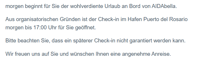 Wäre der Check-In ursprünglich länger möglich gewesen? Verlegt AIDA den Check-In so kurzfristig signifikant vor, müssen sie Folgekosten auch bei individuell anreisenden Gästen tragen (z.B. für einen nun neu zu buchenden Flug).