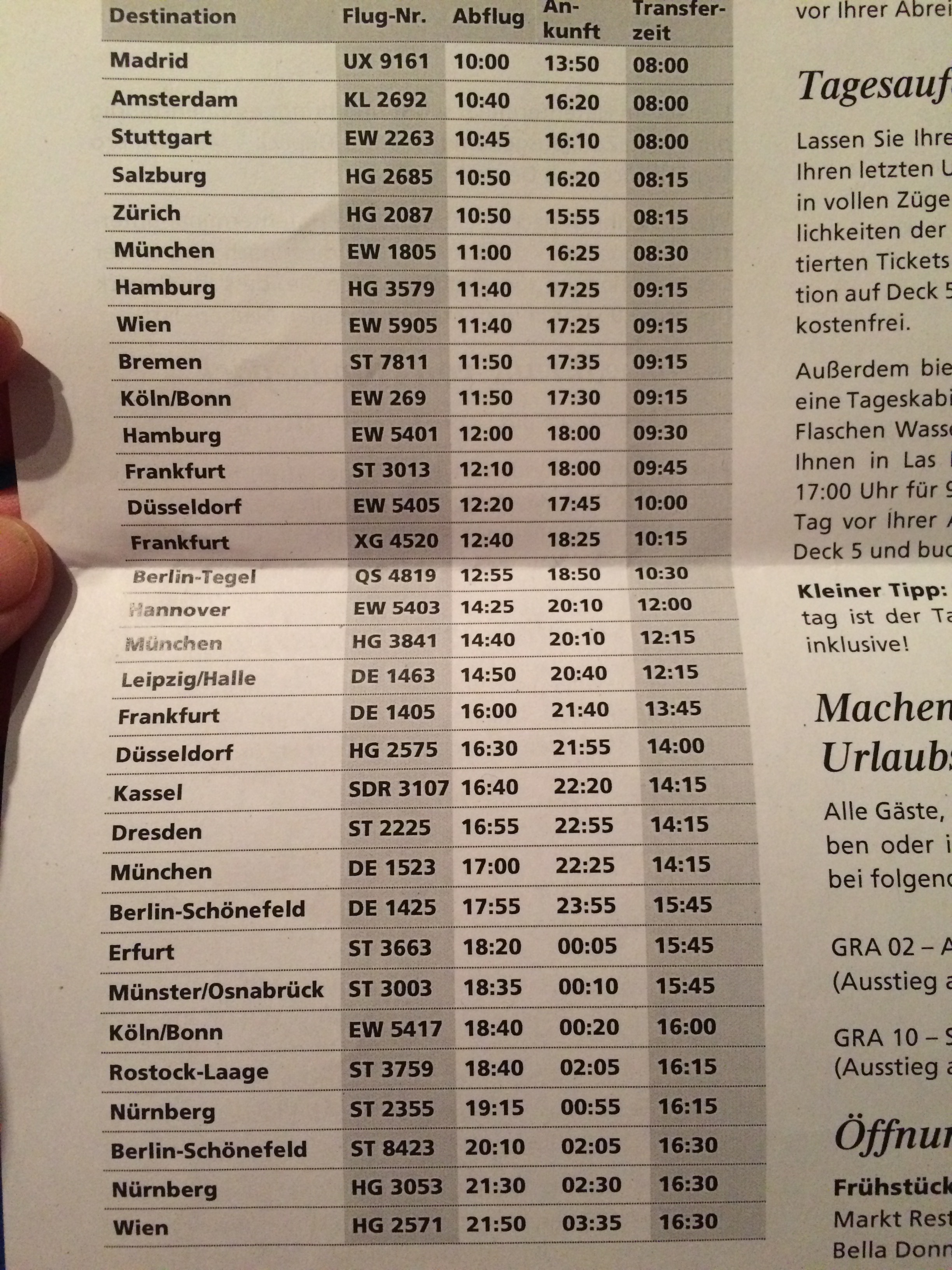 @Gilawir waren vor 5 Wochen auf der Kanarentour mit der Sol.Wir flogen mit Germania von Gran Canaria nach Nürnberg um 19.20 Uhr. waren glaube ich mit Osnabrück der letzte Flug. Die anderen Flüge kann ich dir leider nicht sagen.Jedenfall vor uns.