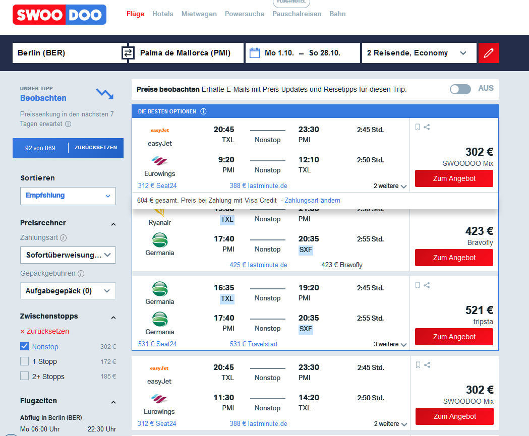 Mit Ryanair ist es zur Zeit durch Laudamotion billiger, aber den gab es bei unserer Buchung nicht und zur Zeit gibt es bei denen auch am 28. 10 noch keine Rückflüge. Könnte zwar mit Ryanair von Schönefeld fliegen, da sind wir dann aber auch bei fast 400 €.