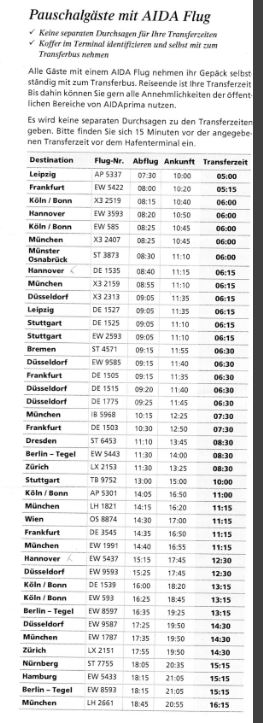 Kommt auch darauf an, wie viele Aida-Pax auf diesem Flieger sind. Wenn es wenige sind, werden schon mal Transfers zusammen gelegt und der Transfer ist schon um 16:30 Uhr. Es gibt immer unterschiedliche Konstellationen, die auf die Abfahrtzeit Einfluss haben.