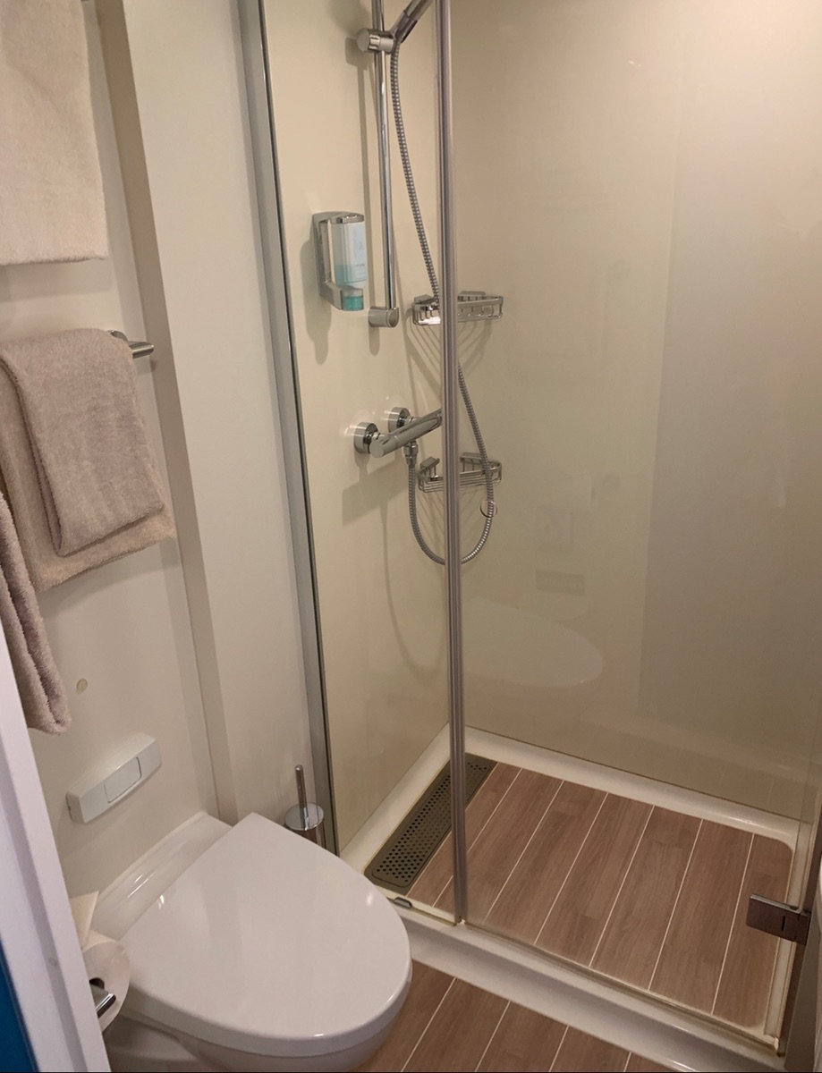 Kabine: Ansonsten ist die Kabine vom Design her in Sand- und Blautönen gehalten, was uns sehr gut gefallen hat. Wir haben die Kabine als ruhig empfunden und die Nachbarn nicht ein einziges Mal gehört. Links geht nach dem Eingang das Bad ab, danach der begehbare Kleiderschrank mit Ablagefächern, Hängestangen, Tresor und noch einmal Kleiderhaken. Es folgen das Bett, ein Holzelement, das Sofa und das darüber liegende Pullmanbett. Auf der rechten Seite gibt es einen Spiegel (hatten wir zuletzt auf der Prima) vermisst, Kleiderhaken, den Schreibtisch mit Schminkspiegel, Föhn, zwei Schubladen und noch einmal Ablagemöglichkeiten. Auf der verhältnismäßig großen Veranda gibt es zwei Stühle, eine Hängematte und einen Hocker.
