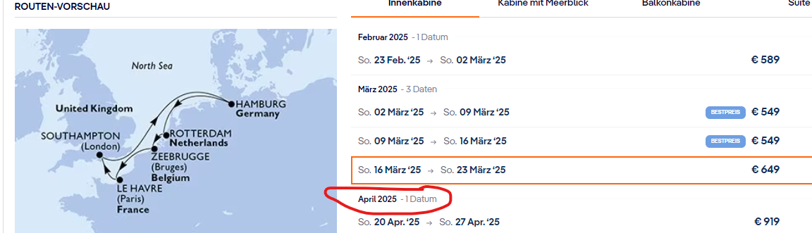 Ist ja nicht schlimm. Ich vermute mal, dass Schiff ist ausgebucht. Eine Reise habe ich allerdings finden können. Aber nur von Hamburg nach Southampton.
