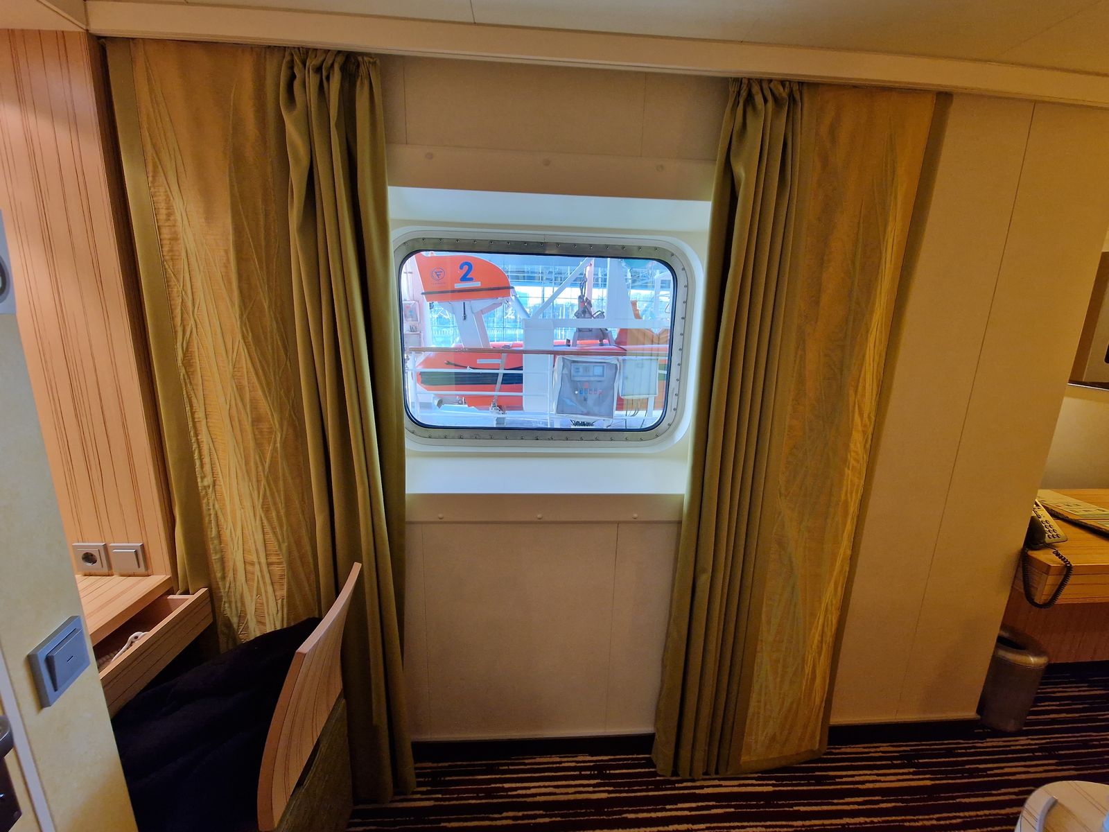 Sie ist anders aufgeteilt als die Kabinen, die man sonst kennt. Links vom Eingang befindet sich das Bad, rechts der Kleiderschrank, geradeaus das Fenster. Hinter dem Kleiderschrank ist das Doppelbett. Vor dem Fenster befindet sich das kleine "Rettungsboot", dennoch kann man gut rausgucken.