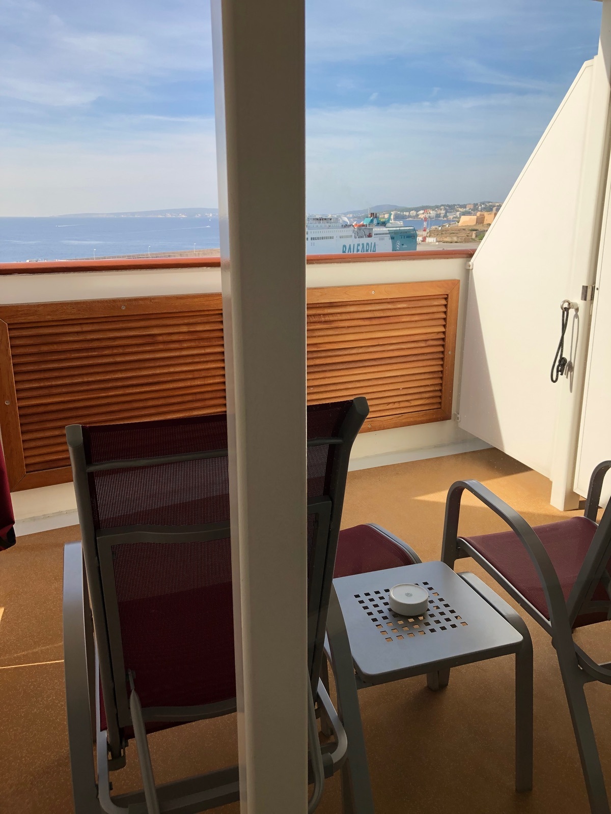 Diese Kabine liegt im Bug des Schiffes und zählt zur Backbordseite. Sie wurde uns im Vario zugeteilt und wir würden sie jederzeit auch im Premium buchen. Die Kabine hat quer zur Fahrtrichtung stehende Betten und ist wie alle anderen Verandakomfort Kabinen ausgestattet. Die Balkontür ist keine Schiebetüre, sondern lässt sich nach außen öffnen. Vor der Balkontüre ist auf dem Balkon noch eine Trennscheibe wegen des Fahrtwindes angebracht. Der Balkon hat eine Stahlwand, so dass man leider nicht auf das Meer blicken kann, wenn man in den beiden Liegestühlen sitzt. Blickt man jedoch im Stehen nach vorne hat man einen tollen Blick. Der Balkon ist sehr groß, so dass sich Liegestühle und ein Fusshocker und Ablagetischchen gut stellen lassen. Schiffsbewegungen waren bei Wind zu spüren. Leider hört man die Toilettenspülung der Nebenkabine, ansonsten ist die Kabine ruhig. Wenn der Anker eingezogen wird, hört man das allerdings in der Kabine auch. War bei uns 1 x der Fall als wir vor dem Suezkanal auf Reede lagen. Die Wege zu den Restaurants sind weit, was der Lage der Restaurants geschuldet ist. Unser Fazit: Tolle Kabine.