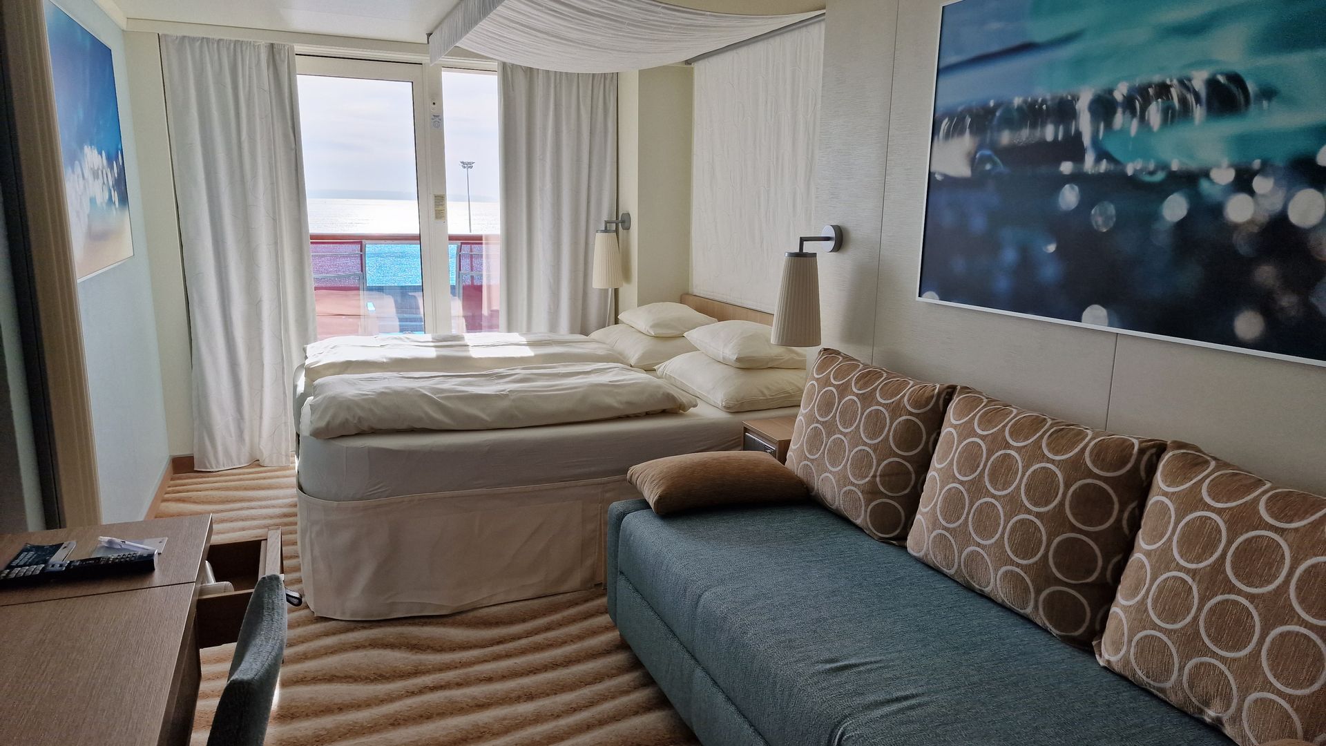 Seegang merkt man etwas, hält sich aber bei der Größe des Schiffes in Grenzen. Das Bett befindet sich entgegen der Fahrtrichtung direkt am Fenster, neben dem Bett ist ein großes Sofa mit direktem Blick auf den Fernseher, daneben der Schrank und das Bad.