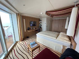 Es ist eine Veranda Komfort mit extra viel Platz (VC) vorne am Bug auf der Steuerbordseite. Die Kabine selbst hat wirklich viel Platz mit 20,5 m2 aber das Highlight ist eigentlich der Balkon mit 16 m2.