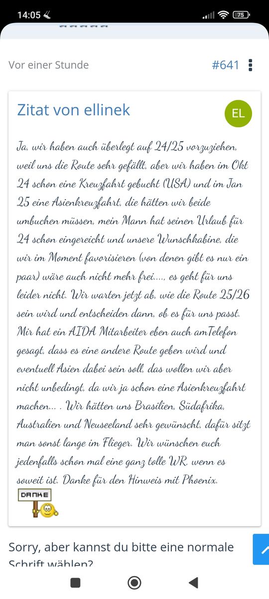 Ja, wir haben auch überlegt auf 24/25 vorzuziehen, weil uns die Route sehr gefällt, aber wir haben im Okt 24 schon eine Kreuzfahrt gebucht (USA) und im Jan 25 eine Asienkreuzfahrt, die hätten wir beide umbuchen müssen, mein Mann hat seinen Urlaub für 24 schon eingereicht und unsere Wunschkabine, die wir im Moment favorisieren (von denen gibt es nur ein paar) wäre auch nicht mehr frei...., es geht für uns leider nicht. Wir warten jetzt ab, wie die Route 25/26 sein wird und entscheiden dann, ob es für uns passt. Mir hat ein AIDA Mitarbeiter eben auch amTelefon gesagt, dass es eine andere Route geben wird und eventuell Asien dabei sein soll, das wollen wir aber nicht unbedingt, da wir ja schon eine Asienkreuzfahrt machen... . Wir hätten uns Brasilien, Südafrika, Australien und Neuseeland sehr gewünscht, dafür sitzt man sonst lange im Flieger. Wir wünschen euch jedenfalls schon mal eine ganz tolle WR, wenn es soweit ist. Danke für den Hinweis mit Phoenix. :sdanke: