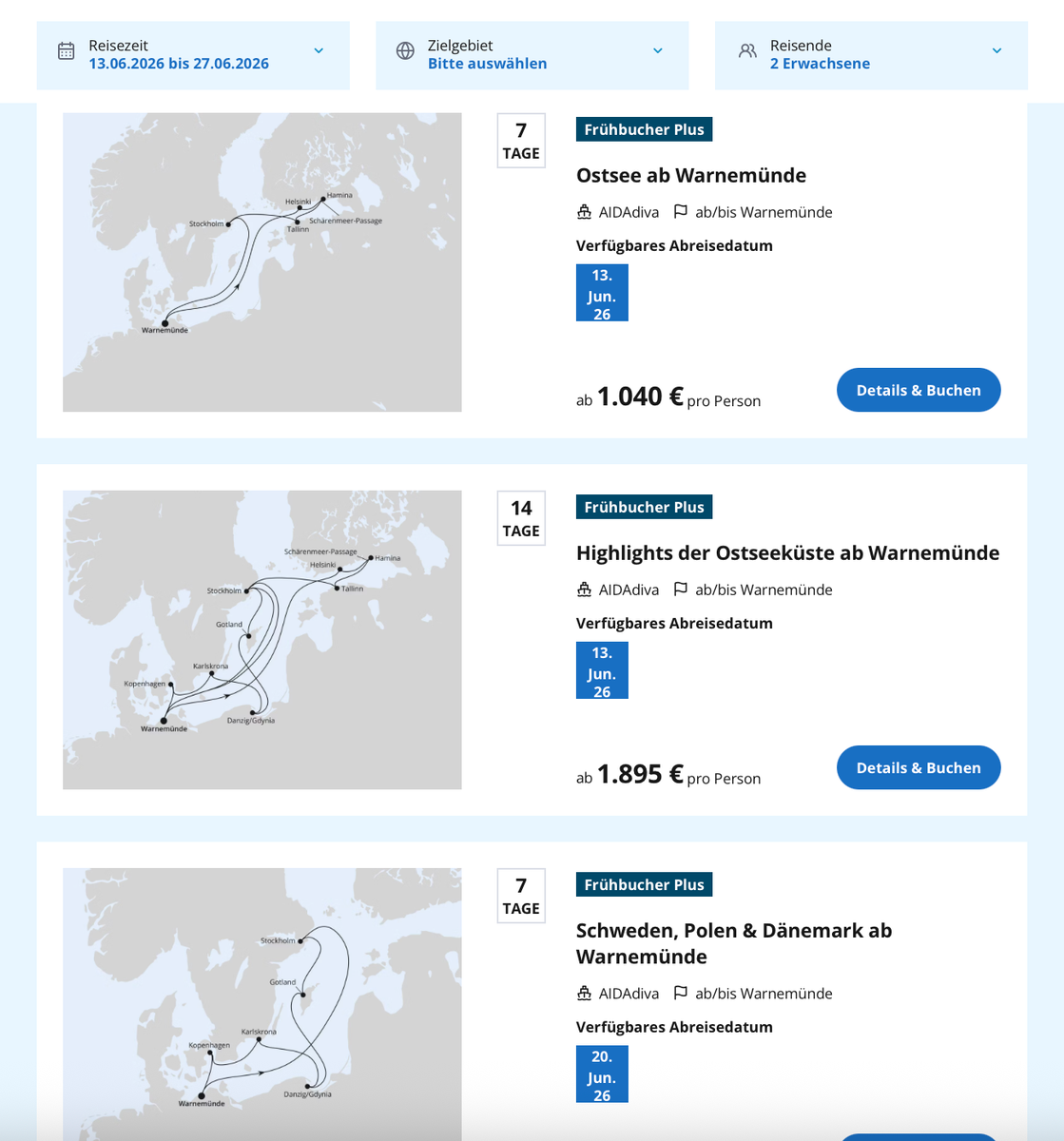 Ne Aber Fehler gefunden - ich hatte als Zielgebiet Nordeuropa eingestellt 🙈🙈🙈🙈🙈🙈 und da ist nun mal Ostsee nicht mit drin 🤣 also alles gut und da . Gott sei dank will ja eine der beiden Touren machen