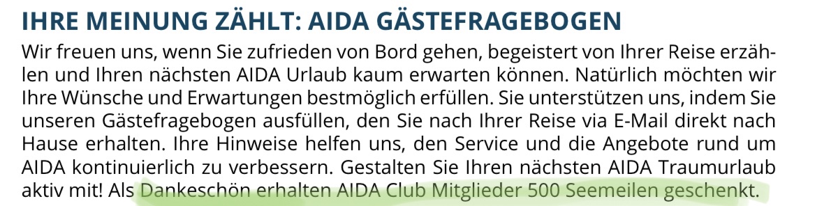 Ich meine in der AIDAheute beim Reiseende letzte Woche gesehen zu haben, dass es nur noch 500 Meilen für den Fragebogen gibt.