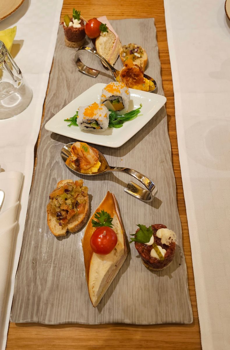Wir hatten auf der Sol auch das neue Club@Sea Event. Es fand in der Almhütte statt. Denke mal an die 60 Leute. Es wurde ein Foto mit dem GM und der Reiseberaterin gemacht. Allerdings keine Info wie man das Foto bekommt. Zu Essen gab es eine Platte (siehe Bild) und zum Trinken Bier, Sekt und den Bierbrand. Ging eine Stunde. Fand es ganz okay. Allerdings war niemand begeistert von der Umstellung.
