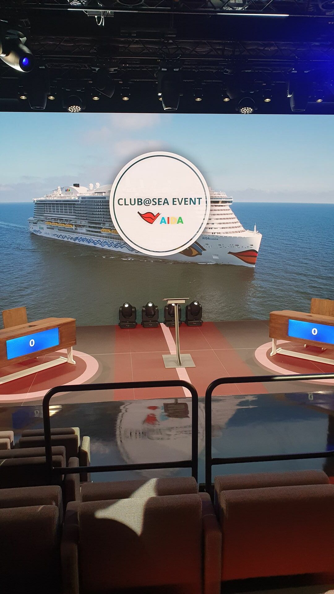 Hallo, wir haben auf AIDAcosma am 12.03.2023 erstmals beim "Club@Sea Event" teilgenommen. Geladen wurde parallel zum Auslaufen aus Abu Dhabi ins Studio X. Hier wurden wir durch GM Nicolas Goelen und dem Chef der Reiseberatung begrüßt und es wurde ein Foto mit den beiden gemacht. Anschließend bekamen wir ein Glas Sekt und jeweils eine Tüte mit Süßigkeiten sowie eine Tüte mit Popcorn gereicht.
