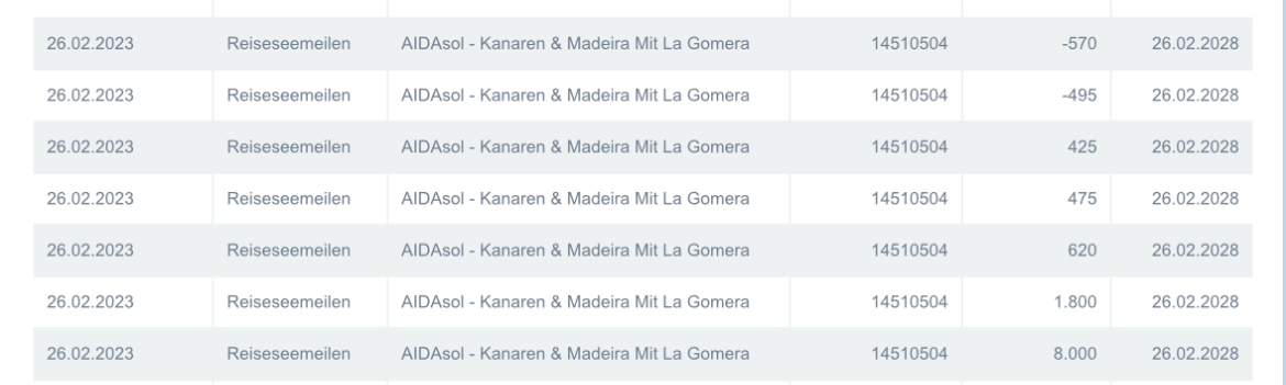 Na auf meinen Seemeilen-Konto ging’s heute rund 😂 Da muss ich die Tage nochmal versuchen, die ganzen Buchungen nachzuvollziehen :gruebel: Die 8000 sind die Meilen fast die Reise. Die kleinen Beträge sind sicher die für vorab gebuchte Sachen in MyAida. Aber dieses hin und her gebuche :gruebel: Und die 1800 :gruebel: