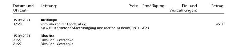 Das kann noch interessant werden, weil man ja zu 100% den Ausflug mit Geld bezahlt, aber dann bei einem Überschuss am Ende der Reise (soll es geben, erst recht wenn kurz vor Ende der Reise ein oder mehrere Ausflüge storniert werden) nur 90% zurück bekommt.