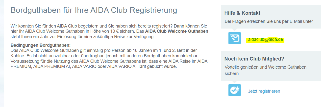 Irgendwie sehe ich nichts im Login vom Club Portal. Auch in keiner Mail sehe ich einen Code. Selbst Google und Aida Hilfe zeigt mir nur, wo ich den einlöse.
