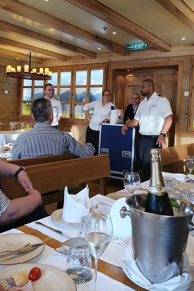 Clubþeffen auf der Prima. Allerhöchstens 50 Teinehmer. Fand auf der Terasse des Rossinis zum Auslaufen in Abu Dhabi statt. Sekt, Häppchen und die Offiziere gingen von Tisch zu Tisch.