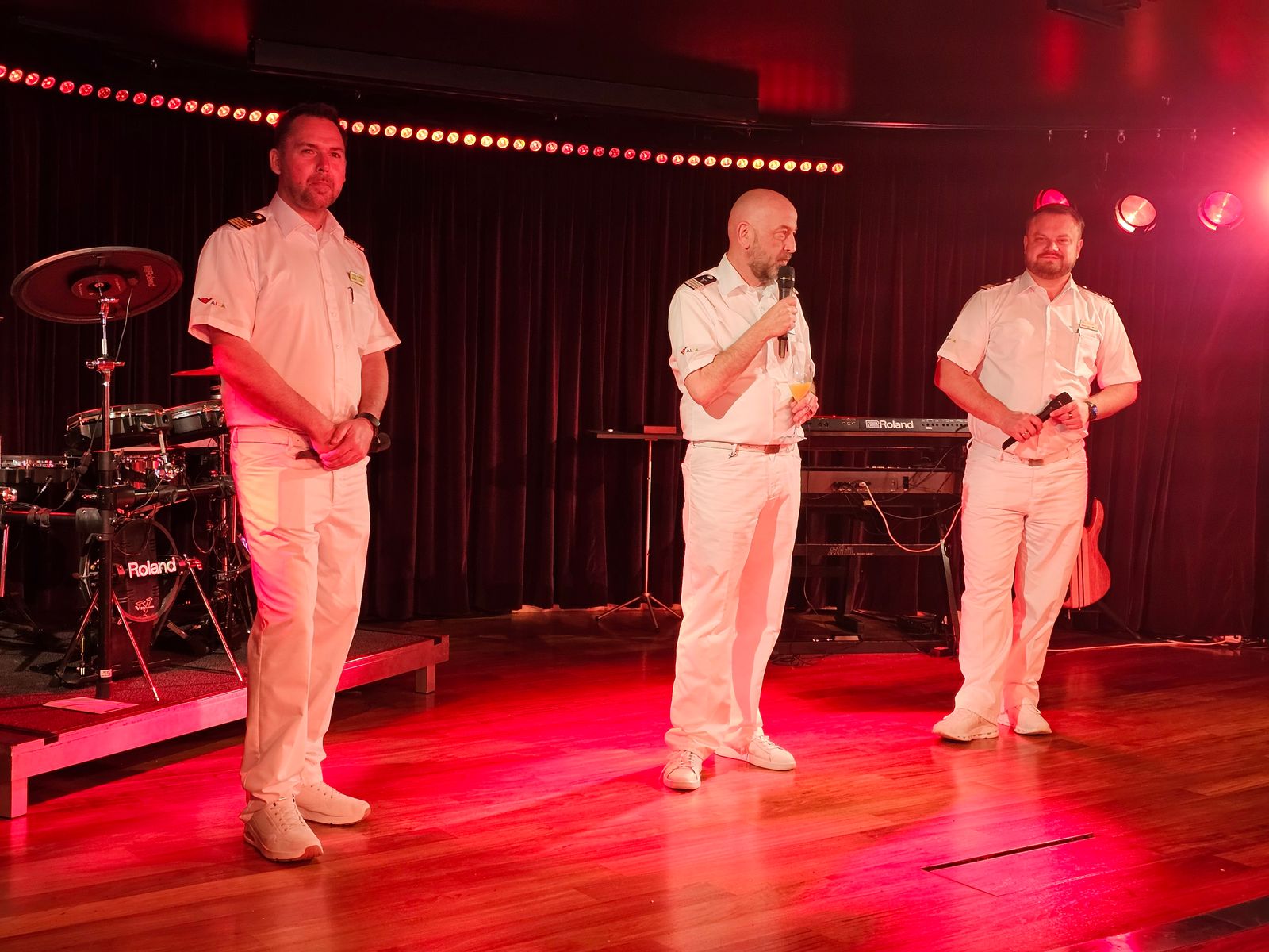 Es gab Prosecco bis zum abwinken, außerdem diverse Cocktails, an einem Buffet konnte man sich kleine Häppchen und Gläschen soviel man und Frau auch wollte, holen. Die Offiziere kamen mit diversen Schnäpsen rund. Herr Becker hat sehr viel erzählt, es gab eine kurze Musikdarbietung und zum Abschluss noch eine kleine Flasche AIDA Kräuterschnaps zum mitnehmen.
