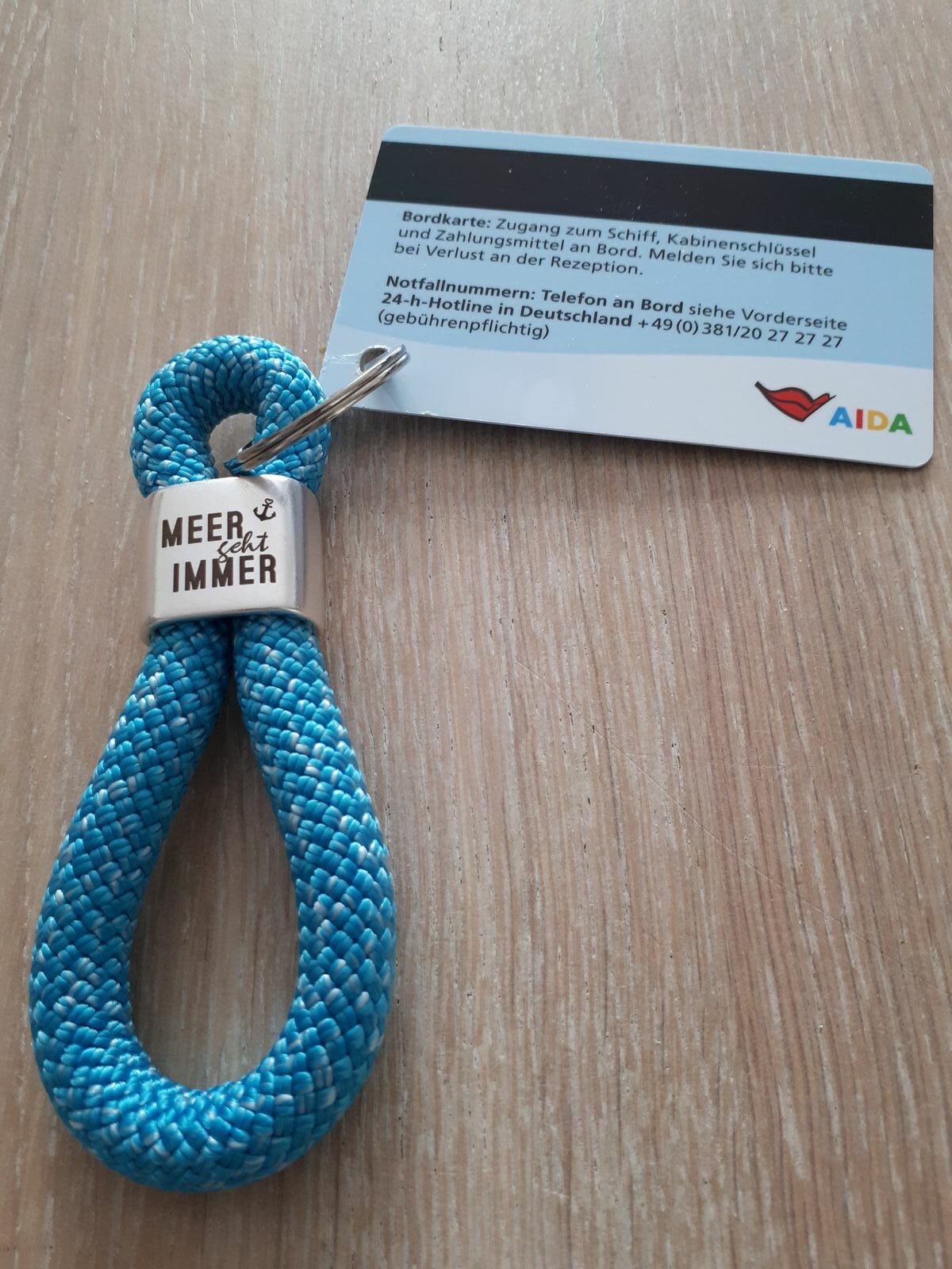 Ich habe mir auf meiner ersten Reise 2016 ein Lanyard gekauft, ganz schlicht in blau, weil ich mir vor der Reise über die Bordkarte keine Gedanken gemacht habe. So brauchte ich an Bord noch eine Lösung ![]()