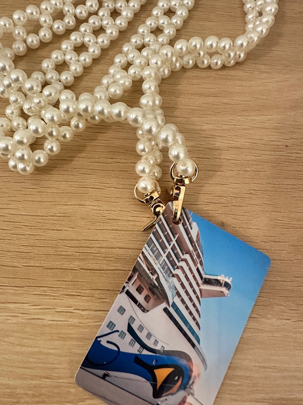 Normalerweise gehört es für uns dazu, für jede Bordkarte ein eigenes Lanyard zu kaufen. Ich trage sie an Bord tatsächlich um den Hals oder in der Hosentasche, da die Handtasche auf der Kabine bleibt. Bei Landgängen ist sie im Rucksack.