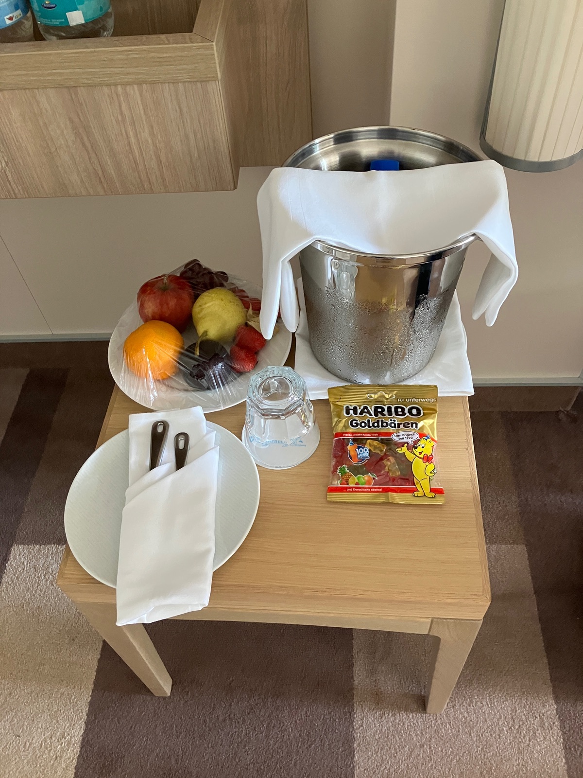Wenn ich mich richtig erinnere ein Obstteller, Kinderschokolade, Apfelshorle und Gummibärchen.