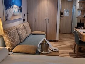 Wir haben eine Woche in dieser Juniorsuite mit Wintergarten verbracht. Die Kabine befindet sich im vorderen Bereich direkt am Übergang von den Kabinen mit Wintergarten zu den Kabinen ohne diesen. Durch den Übergangsbogen ist die Kabine überdacht und der Balkon ist nochmal ein Stück größer als bei der Nachbarkabine mit Wintergarten. Auf den Decksplänen ist es so nicht ersichtlich, dort sieht es so aus, als wäre es die letzte Kabine vor dem Bogen. Auf dem Sicherheitsposter kann man es aber erkennen.