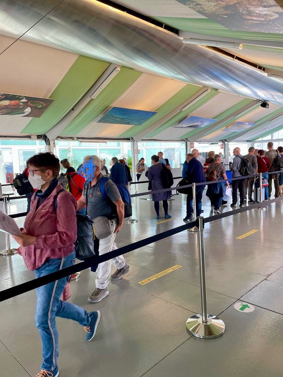 Teneriffa hat auch an der Südpier ein Terminal. Eine geschlossene Check-in Halle (Bild 1, selbst aufgenommen) und eine offene Halle für die Koffer (Bild 2, von YouTube). TUI hat dort ja schon immer die Passagierwechsel durchgeführt. Aber die Kapazitäten reichen definitiv nur für ein Schiff.