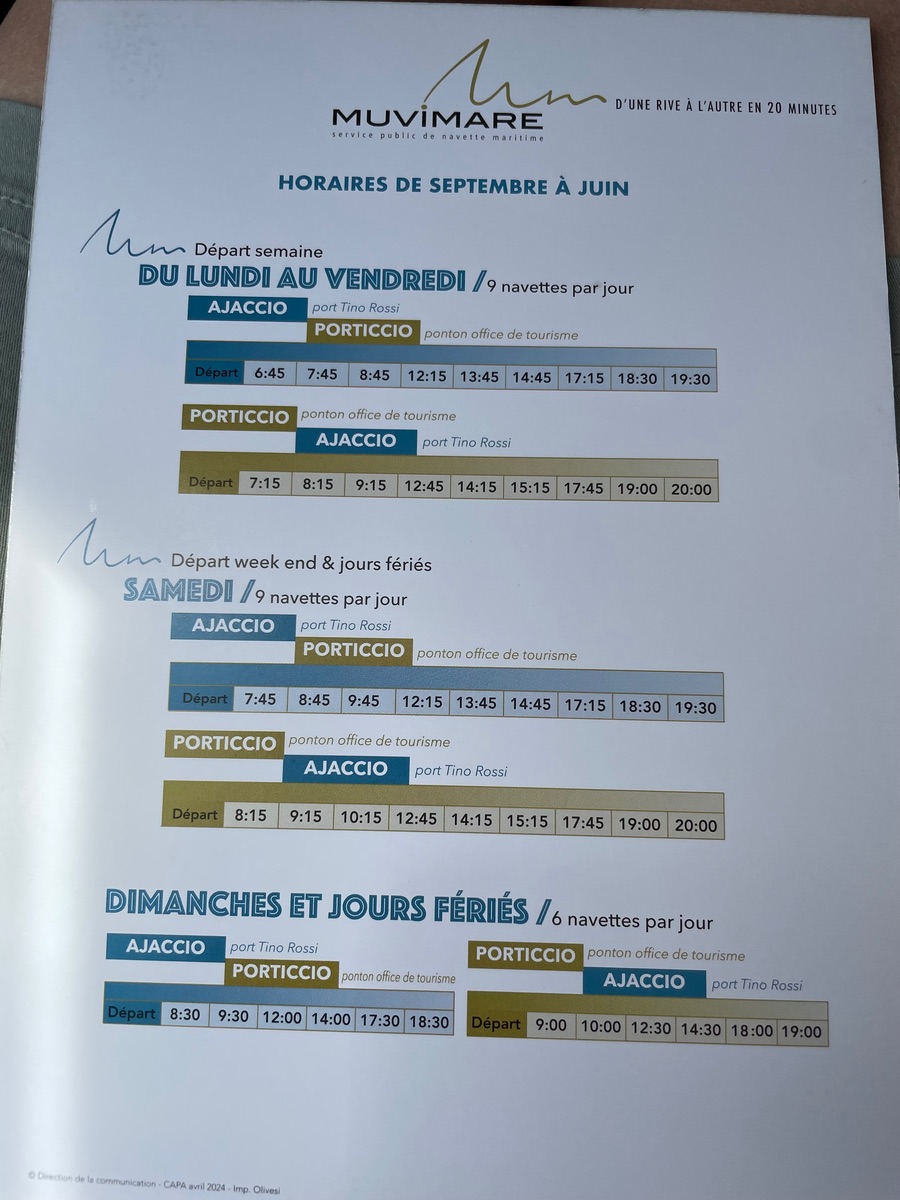 Wir sind nicht mit der Fähre gefahren. Im Hafen von Ajaccio stand ein Schild „stündlich“. Den Plan hab ich nur schnell am Strand von Porticcio fotografiert (und gar nicht richtig gelesen).