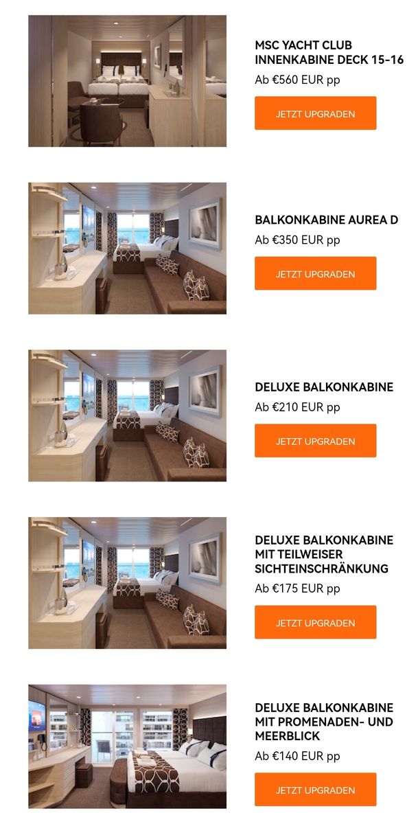 Ich habe mir bei der Buchung der Reise keine Preise für andere Kabinenkategorien notiert, so dass ich jetzt nicht vergleichen kann, ob, bzw. wieviel günstiger ein Upgrade auf eine andere Kategorie zum jetzigen Zeitpunkt im Vergleich zur damaligen Buchung wäre.