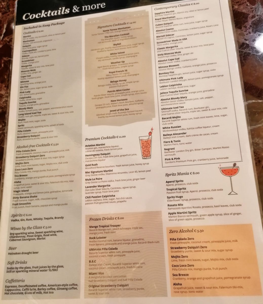 also wir waren letzte Woche auf der Virtuosa. Wir hatten auch das easy plus gebucht. Da waren alle Getränke bis 8€ inkludiert. Egal was und in jeder Bar. (Ausgenommen der Roboter und die Getränke von dem Schokoladen). Dies soll zum Sommer wohl auf 9€ angehoben werden, aber dafür erhöht sich auch der Preis.