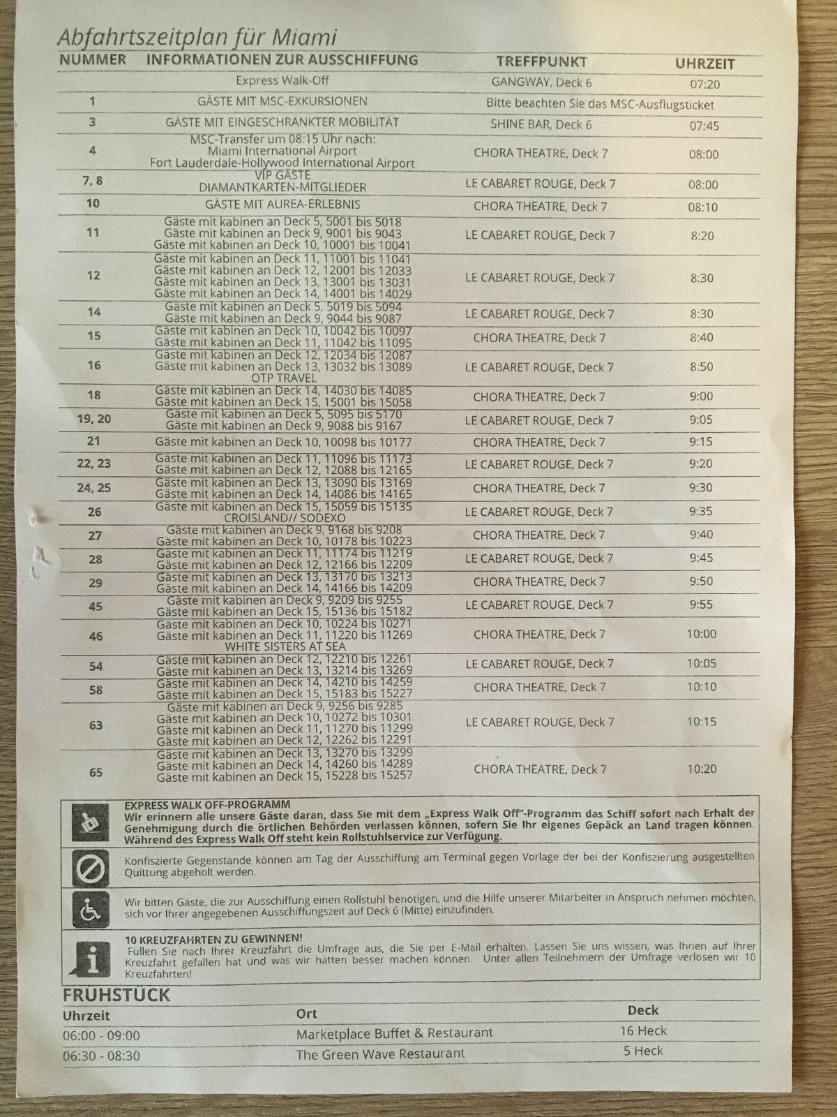 Meine Erfahrung bei MSC in den USA war, dass da nichts ist mit einem gemütlichen Vormittag am Abreisetag. Die Kabine mussten wir spätestens um 7.30 verlassen haben. Die Zeiten zum Verlassen des Schiffes werden zugeteilt. Da Amerikaner gerne so früh wie möglich vom Schiff gehen, durften die Suiten/Yacht Club Gäste zuerst. Sie hatten die Gruppe 1. Wir als Diamond Gäste die Gruppe 5 mit Ausschiffung um 8.10 (wir sind dann um 8.30 gegangen). Ansonsten ging es Deckweise von oben nach unten. Man bekam einen Aufkleber für die Bordkarte mit der Nummer und die wurde auch streng kontrolliert.