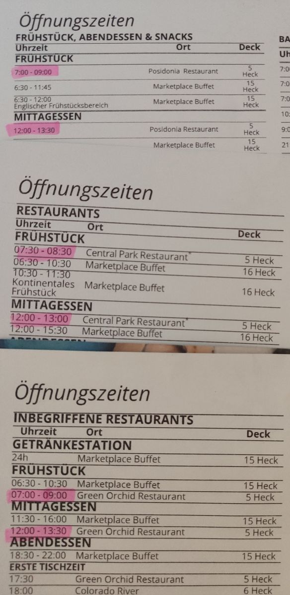 Ich würde auf jeden Fall dazu raten, immer in der MSC for Me App die tagesaktuellen Öffnungszeiten zu prüfen. Auf unserer aktuellen Tour mit der Miraviglia gibt es auch nur die Brunch-Nummer in den Bedienrestaurants an den Hafentagen, und das Büffetrestaurant ist zweimal am Tag für jeweils zwei Stunden geschlossen. Das hat einen Tag dazu geführt, dass wir nur noch den British Pub als Anlaufstation für ein Abendessen hatten, weil wir die Tischzeit im Bedien-Restaurant verpasst haben und das Buffet von 21-23 Uhr geschlossen war. Ist ja auch viel logischer, das Buffet von 23-2 Uhr zu öffnen, als von 21-23 Uhr.