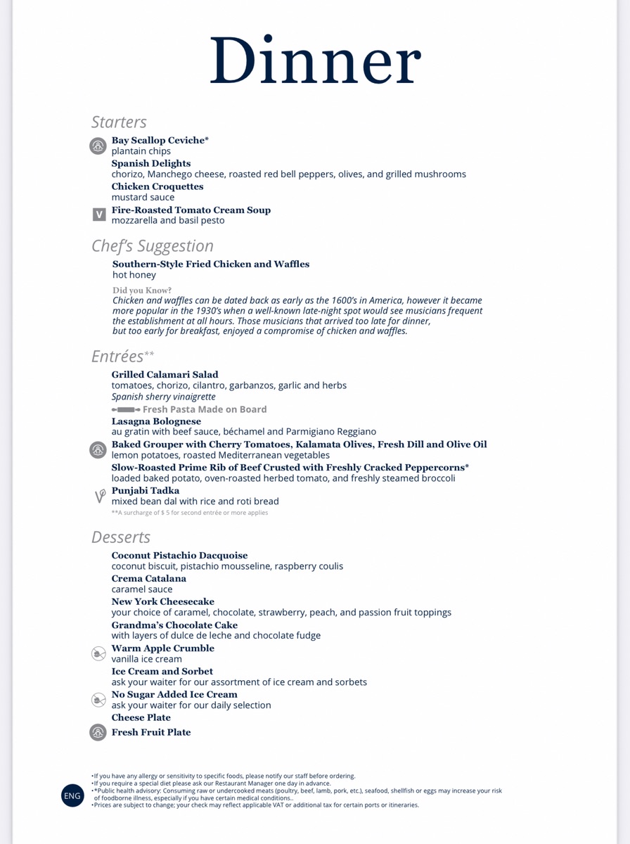 Schau mal Charlynn . Hier ist eine Menu Karte aus dem inkludierten Bedienrestaurant von unserer Kreuzfahrt im letzten Oktober. Die führte von New York City bis nach Kanada. In Europa dürfte sich die Auswahl unterscheiden. Aber Du kannst einen Eindruck über die Auswahl bekommen. Das Menu wechselt täglich, die Classic Favorites gab es jeden Abend.