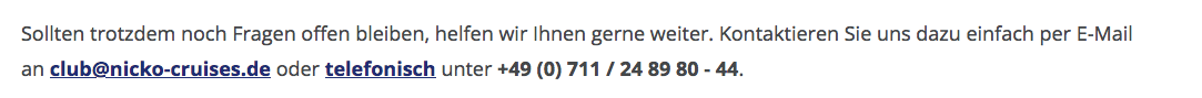 Jetzt bin ich auch neugierig geworden und habe mich mal angemeldet. Dabei hab ich festgestellt, dass Nicko Cruises in unmittelbarer Nachbarschaft zu meinem früheren Arbeitgeber in Stuttgart "wohnt". Das schafft doch mal Vertrauen... da kann ich zur Not auch vorbeigehen, falls was mit einer Buchung nicht so läuft.