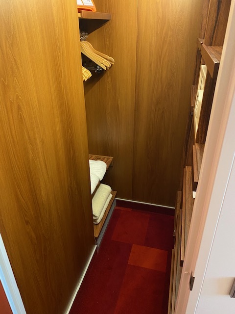Die Kabine hat einen begehbaren Kleiderschrank und ist eine von 12 Kabinen auf der Nova mit direktem Einblick auf Deck 8 im Heckbereich direkt an der Treppe zur Lanai-Bar.
