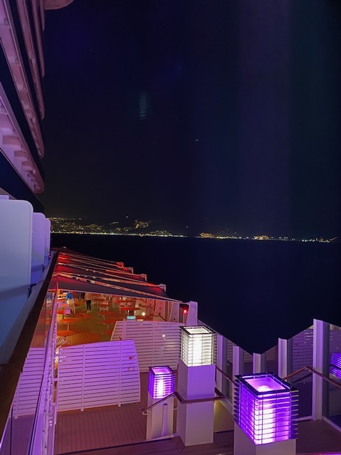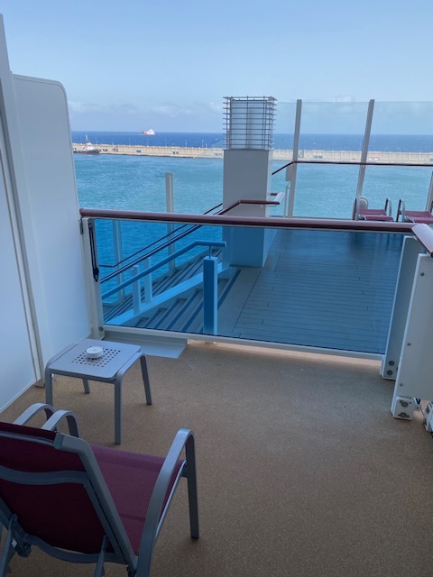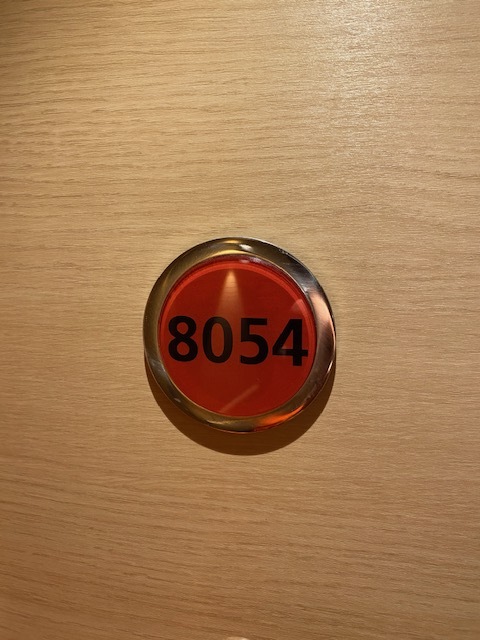 Die Kabine hat einen begehbaren Kleiderschrank und ist eine von 12 Kabinen auf der Nova mit direktem Einblick auf Deck 8 im Heckbereich direkt an der Treppe zur Lanai-Bar.