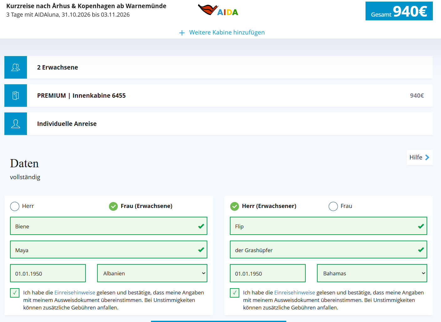 Aber mal reine Theorie - keine Ahnung ob es erlaubt ist. Funktionieren wird auch Fall 2. Die Homepage von AIDA weiß ja nicht wer am Bildschirm sitzt. Solange die Daten exakt stimmen kann ich dort doch für alle und jeden buchen.