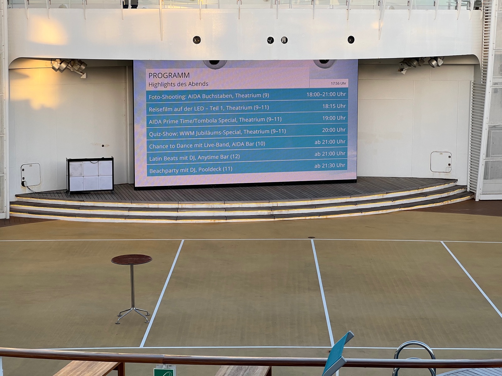 Die Diva hat seit ihrem letzten Werftaufenthalt eine Videowand auf der Pooldeckbühne erhalten. Ich denke, dass dies bei der Bella auch bald der Fall sein wird.