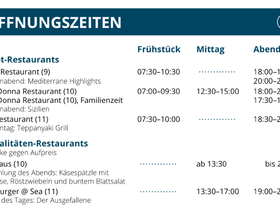 Auf der Luna (Norwegische Fjorde Ende Juni) waren Nachmittags an den Landtagen Almhütte (Brauhaus) und Best Pizza (Best Burger) von 13 Uhr bis 17 Uhr auf. Lief man Nachmittags mal durch die Hütte gab es immer freie Plätze.