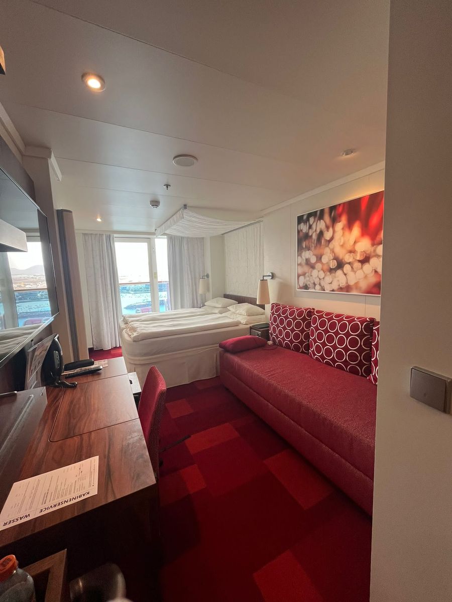Wir haben diese Kabine im Vario zugeteilt bekommen. Es handelt sich um eine Veranda Komfort Kabine mit begehbaren Kleiderschrank. Die Kabine befindet sich zwischen den mittleren und hinteren Fahrstühlen und ist eine sehr ruhige Kabine die wir auch im Premium buchen würden.