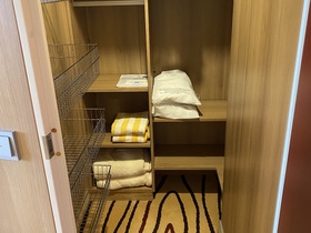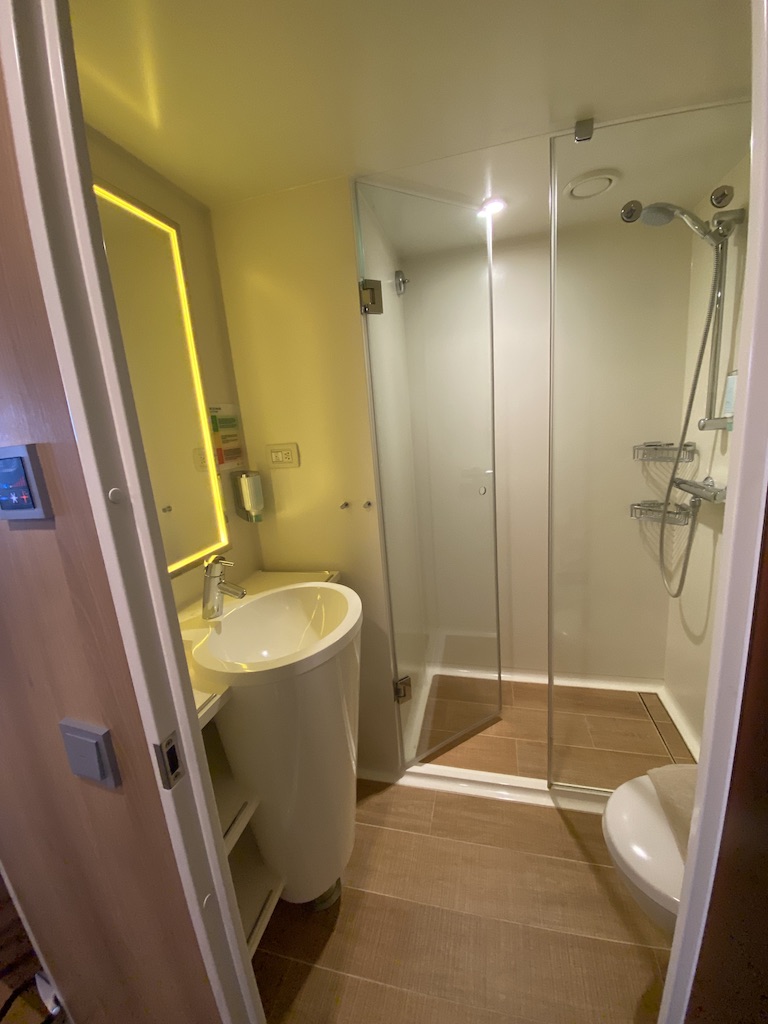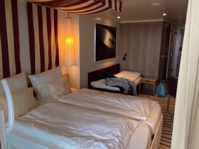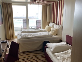 Sehr schöne, ruhig gelegene 3-Bett Veranda - Kabine mit begehbarem Kleiderschrank auf der Steuerbordseite. Doppelbett steht nahe dem Balkon, die Couch, bzw. das 3. (sehr bequeme) Bett steht zwischen Schrank und Doppelbett in einer Art Nische. Auch für 3 Personen ist genug Platz. Blick nach unten auf den Außenbereich des Organic Spa - man hört gelegentlich die Unterhaltungen der Leute im Whirlpool (stört aber nicht wirklich). Wir würden die Kabine sofort wieder buchen!