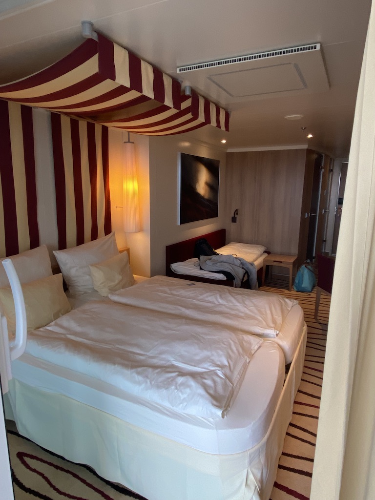 Sehr schöne, ruhig gelegene 3-Bett Veranda - Kabine mit begehbarem Kleiderschrank auf der Steuerbordseite. Doppelbett steht nahe dem Balkon, die Couch, bzw. das 3. (sehr bequeme) Bett steht zwischen Schrank und Doppelbett in einer Art Nische. Auch für 3 Personen ist genug Platz. Blick nach unten auf den Außenbereich des Organic Spa - man hört gelegentlich die Unterhaltungen der Leute im Whirlpool (stört aber nicht wirklich). Wir würden die Kabine sofort wieder buchen!
