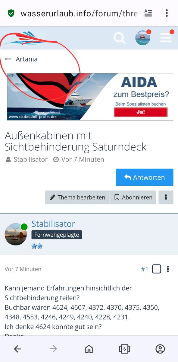 geh mal auf die Phoenixseite,irgend eine Reise mit der Artania raussuchen und dann oben auf 360Grad Rundgang. Außenbereich backbord vorne, da hängt ein Stahlträger der Rettungsboote vor dem Fenster, das ist bei der 4240 (und anderen)die Sichtbehinderung. Blick auf die Reling ist frei.
