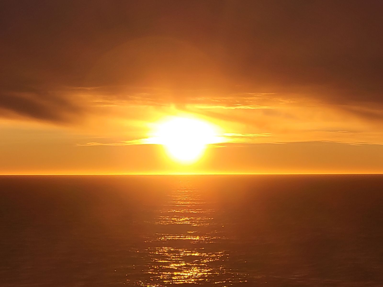 Was für ein Sonnenuntergang gestern Abend auf dem Weg nach Narsaq. Viele Eisberge begleiten uns.
