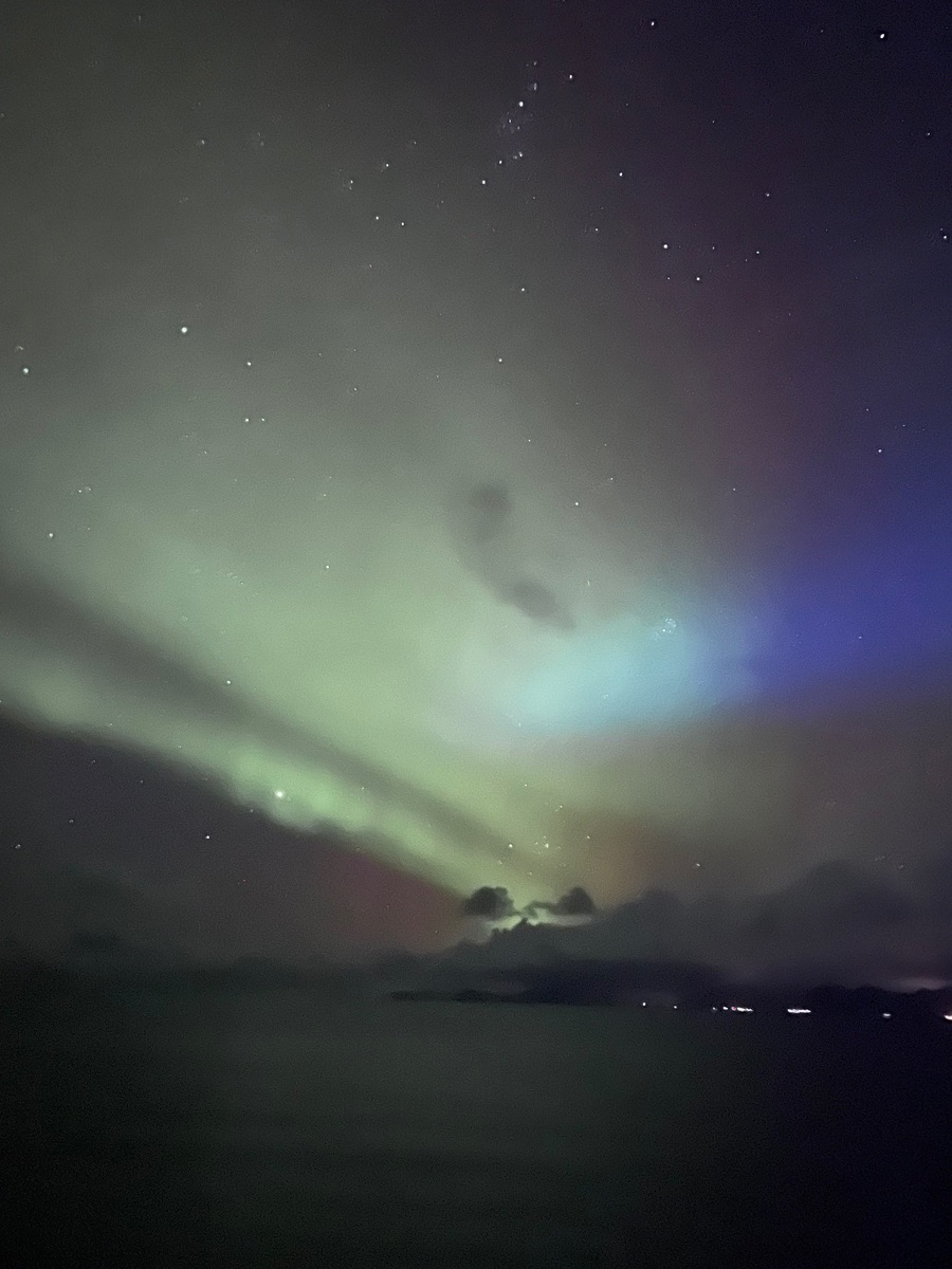 Wir sind dann erst ungefähr eine Stunde nach Norden gefahren in der Hoffnung, dass es dort ebenfalls aufklart. Aber Fehlanzeige. Also ging es wieder zurück Richtung Camp. In der Nähe davon konnten wir dann zwischen Schieferplatten die Lichter sehen. Es gab außerdem Kaffee, Tee, Brote und Schokolade. Von da aus sind wir dann noch weiter zu zwei weiteren Stopps, bis wir gegen Mitternacht wieder am Schiff waren.