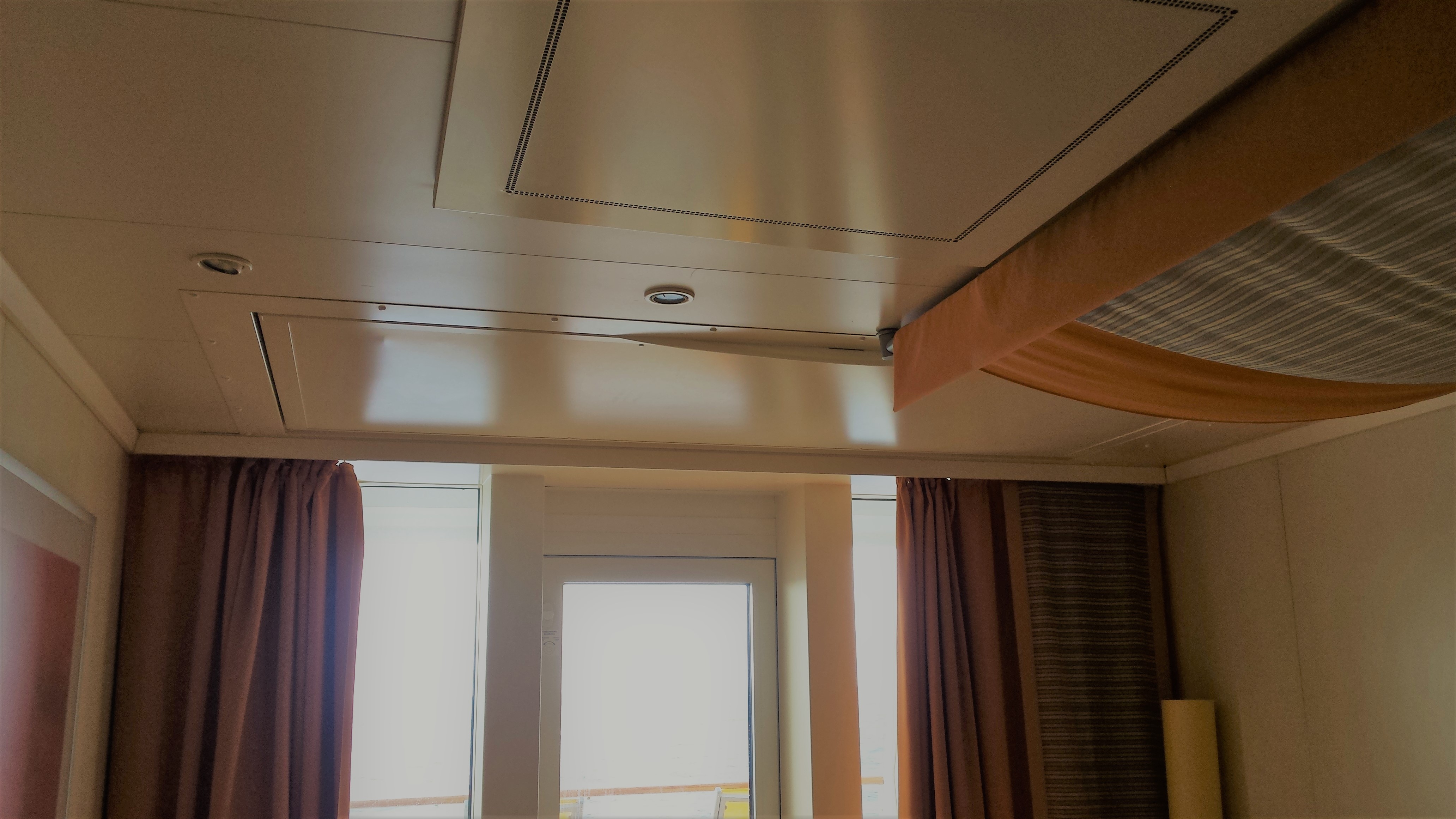 Normale 4-Bett-Kabine. Ein Bett kann von oben vor der Balkontüre herabgelassen werden, das andere ist ein Sofabett, sonst Doppelbett