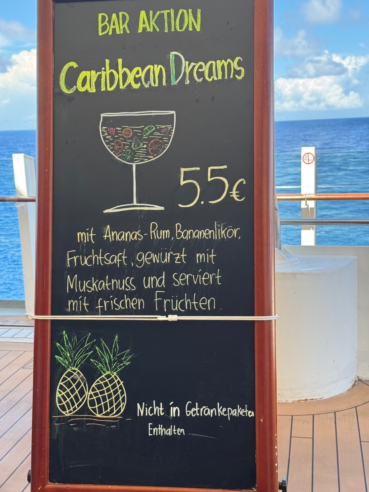 Es gibt übrigens noch Cocktails mit frischen Früchten, aber die kosten extra und sind nicht in den Getränkepaketen enthalten. Letzte Woche für 6,50, diese Woche neuer Name und 1 Euro billiger
