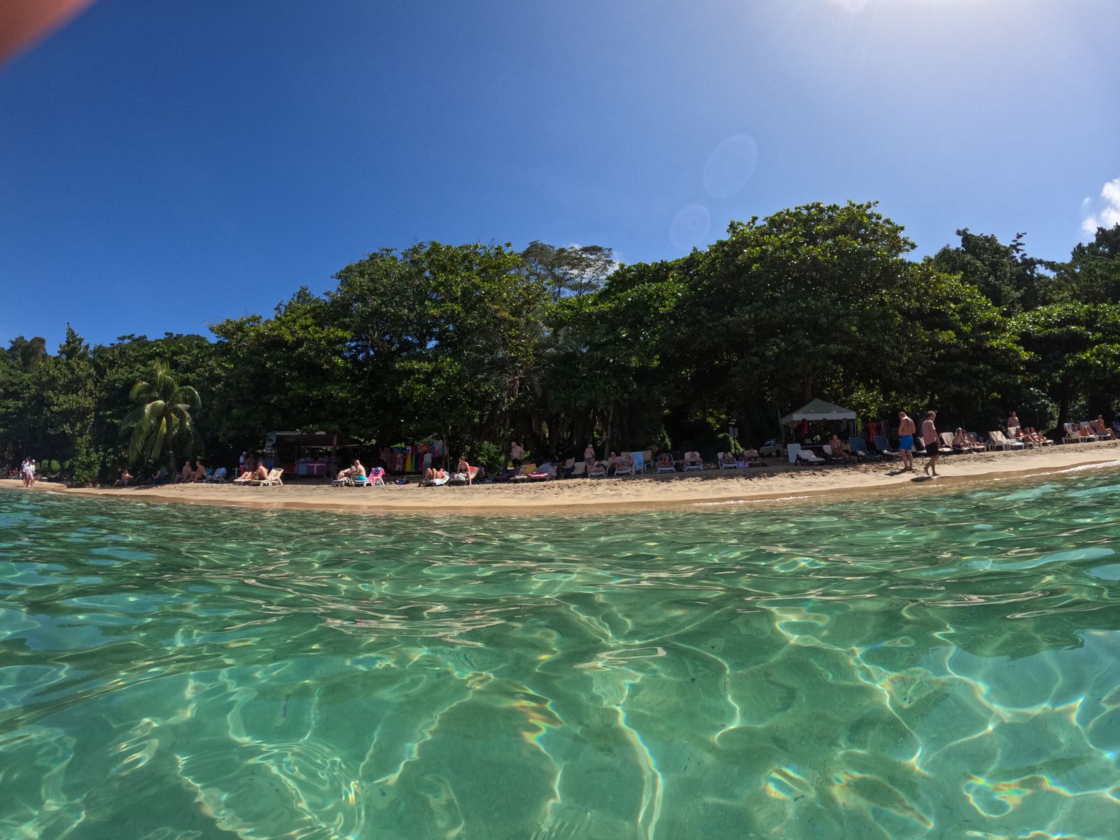 Die Stunden am Strand bis 14 Uhr waren reine Erholung von der Anreise. Bestes Wetter, zwei Bier oder einen Rum Punsch für 5 USD, warmes Wasser (leider mit kleinen, aber ungefährlichen Quallen), Sonne satt, 10 Euro pro Liege und lustige Begleitung.