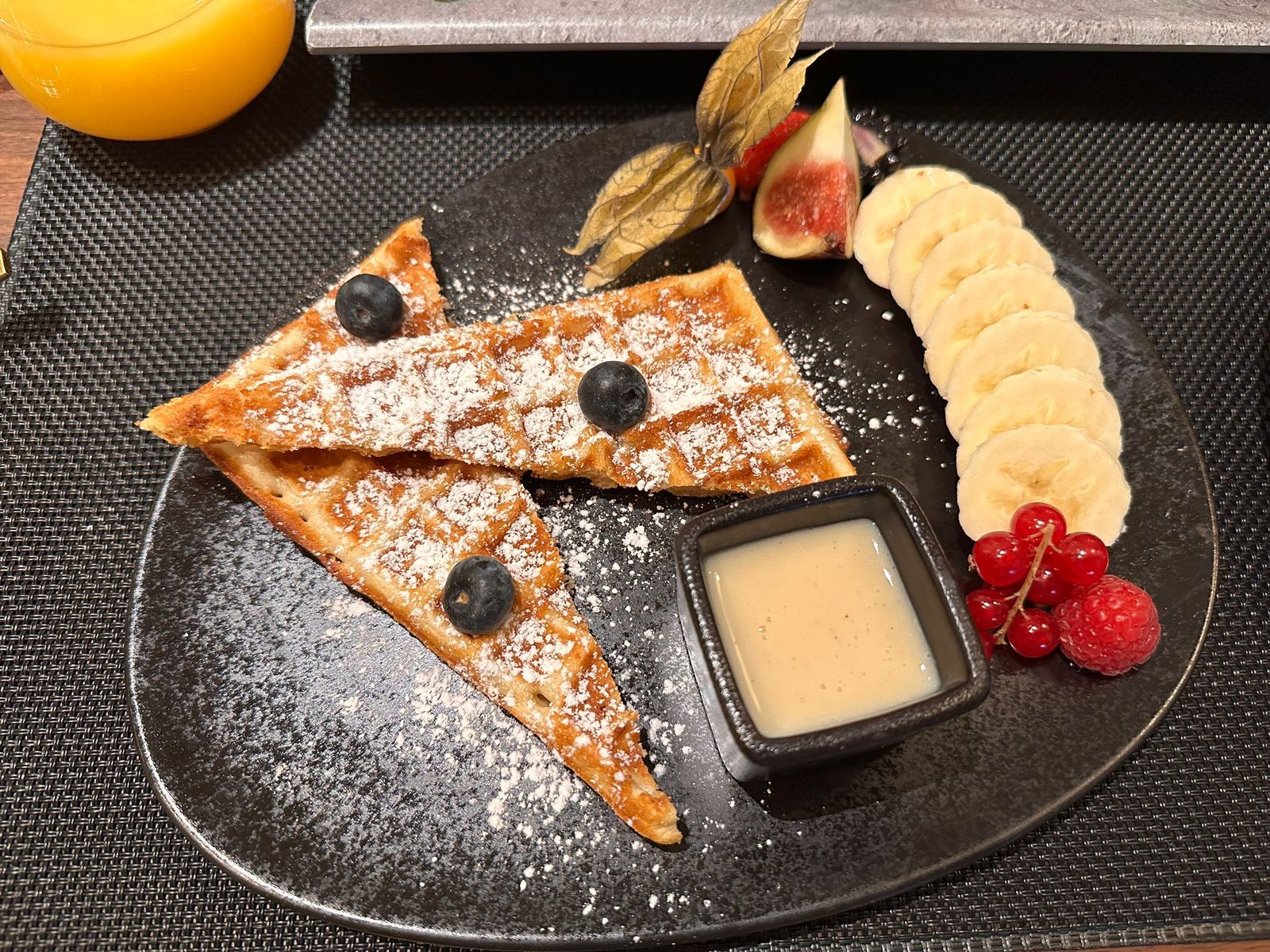 Mein Freund hatte übrigens noch eine vegane Waffel bestellt. Foto anbei. Die hat aber sehr gut geschmeckt. Beim Cappuccino, Latte usw. konnte man übrigens noch wählen, ob man diesen mit Hafermilch oder normaler Milch möchte.