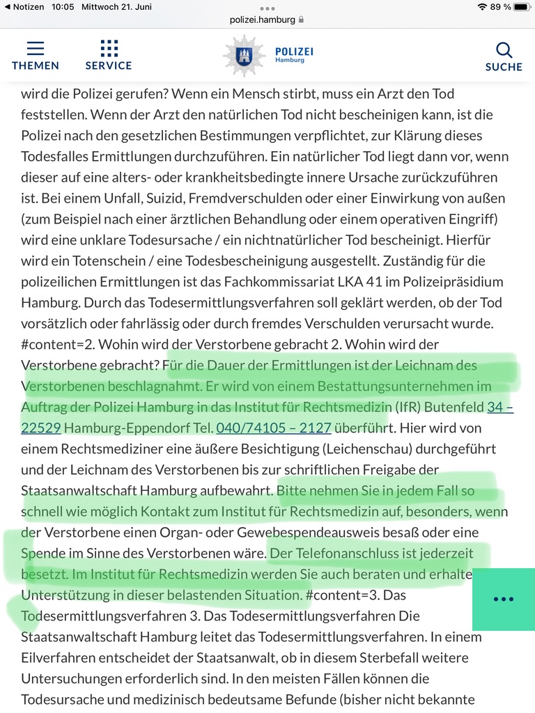 Neben dieser ganzen Tragik, kann ich mich aktuell nicht um die Formalitäten kümmern. Es liegt mir kein Totenschein vor, noch weiß ich an wen ich mich wenden kann, um eine Sterbeurkunde zu beantragen. Das Standesamt meines Wohnorts hat bereits abgewunken. Mein Mann liegt in der Gerichtsmedizin in Hamburg und ohne Sterbeurkunde kann ich ihn nicht beerdigen. Aber keiner kann mir sagen, an wen ich mich wenden kann.
