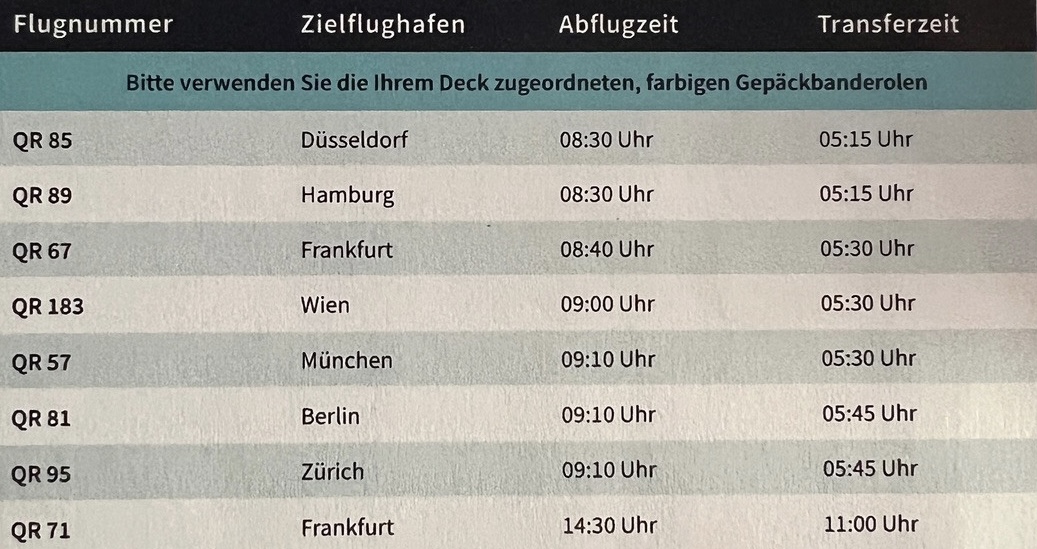 Ja die Flugzeiten ab/bis Doha sind wirklich wahnsinnig unattraktiv (zumindest für mich), man verliert quasi zwei ganze Tage wenn man nicht den einen Flieger ab/bis Frankfurt erwischt. Denn während die Hinflüge sehr früh landen, gehen die Rückflüge alle ganz früh morgens wieder zurück.
